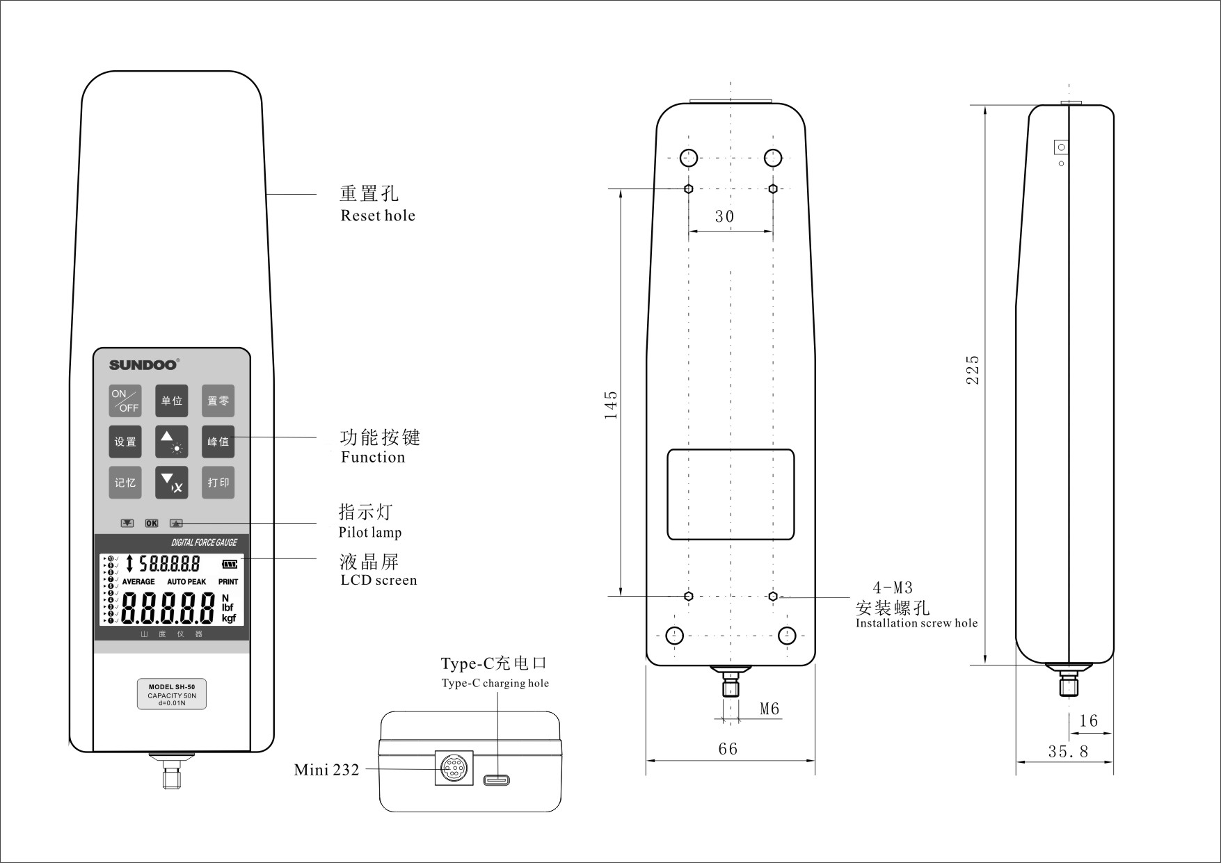 高精度高分辨率,准确度0.5级,最小读数达0.001N; 专用于电脑键盘、按键按钮的按压力测试,并可选配SPF按键专用测试机架,组合成专业的按键按钮试验机; 峰值自动解除功能,抓取测试中的峰值,保持显示1~10秒(可自由设定)后自动解除,等待下一个峰值); 比较功能,上下限偏差值自由设定,红绿指示灯及蜂鸣器自动声光报警设置; 记忆功能,可存储10组测试数据,平均值计算功能; 三种单位变换,可换N、kgf、lbf三种计测单位,并自动换算; LCD液晶屏可翻转显示,按住单位键3秒后放开,可翻转LCD液晶屏显示方向; 自动关机功能, |