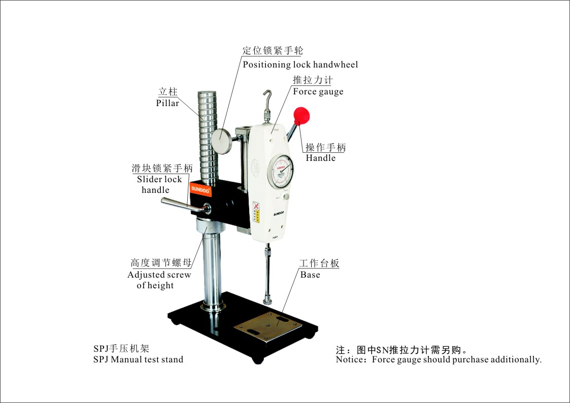 SPJ手压机架配备推拉力计。适用于各行业和科研机构作拉压负荷、插拔力、破坏试验测试。机架采用齿轮副传动,手压式操作,机架上下高度可调节,测力计上下移动设有定位结构,具备手动操作、简单稳定、快速高效、适合批量测试。