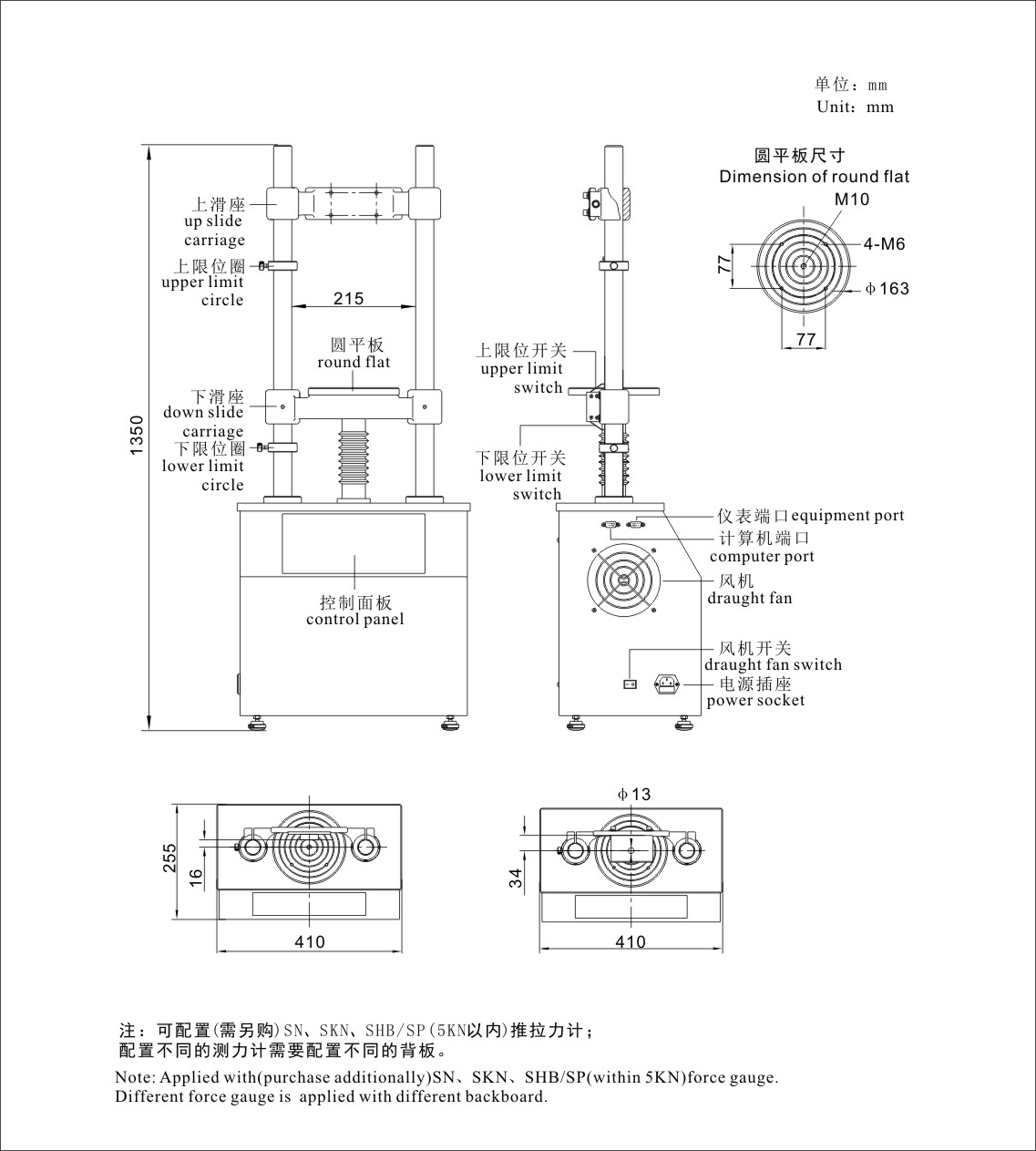 可配置(需另购):SHB/SP(2N~10KN)推拉力计,各种推拉测试工装、夹具。